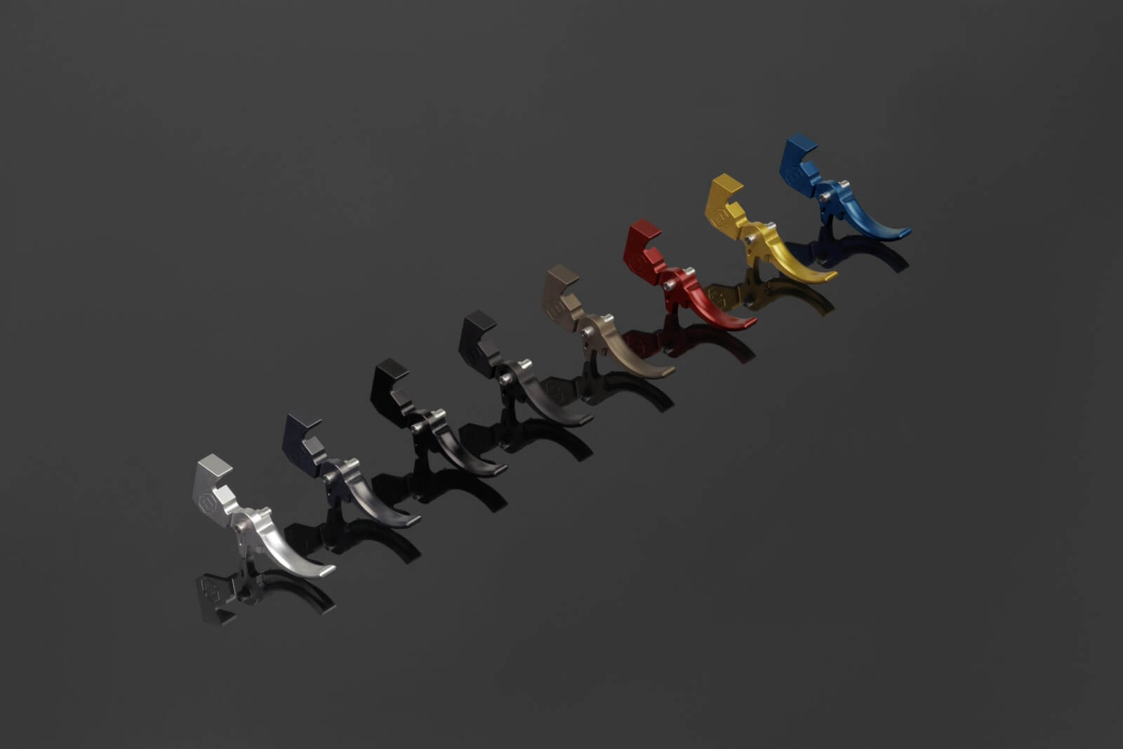 Aftrækkeren er lavet i CNC aluminium. Modellen her er 1E1 som har en buet aftrækker