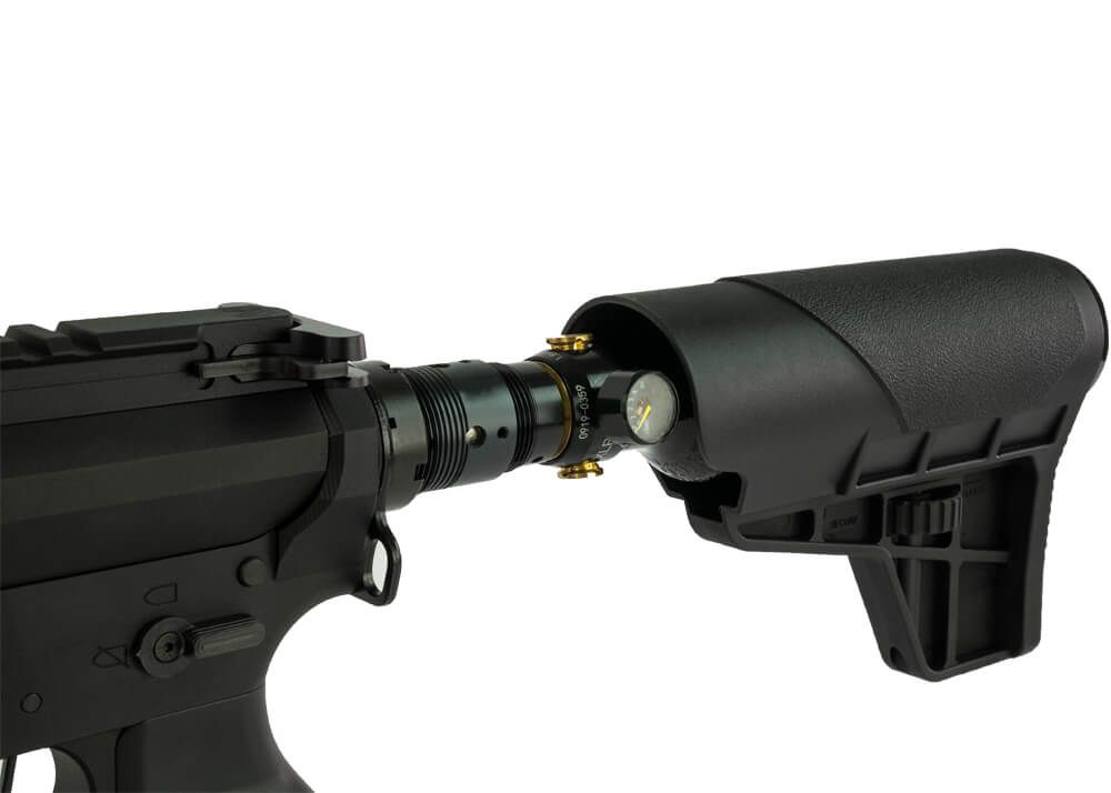 Det, der virkelig skiller Unleashed-modellen ud, er det medfølgende Aero70-system. I stedet for en ekstern slange er lufttanken monteret direkte bagpå riflen og fungerer som selve kolben. Det giver et utroligt kompakt og balanceret setup, hvor du aldrig skal bekymre dig om slanger, der sidder fast i grene eller udstyr.