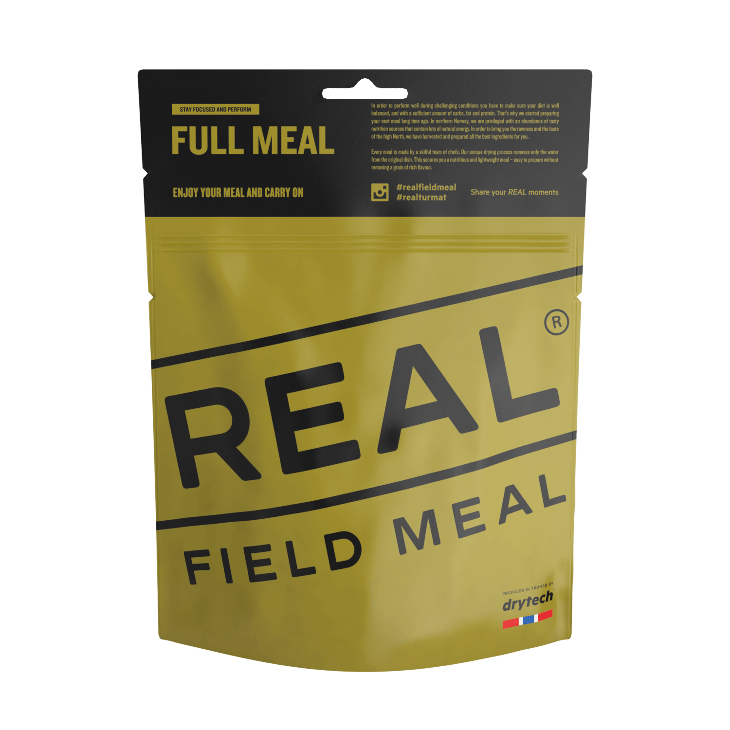 Real Field Meal er DryTechs svar på et sundt og nærende varmt måltid. Deres Field Meal serie er lavet af de bedst mulige ingredienser og deres kokke gør hver dag en reel og stor indsata for at lave et måltid der har en god smag men som også balancerer mellem ernæring og smag! Hovedmålet med denne serie er at man får den 100% naturlige smag og at øge din energi.